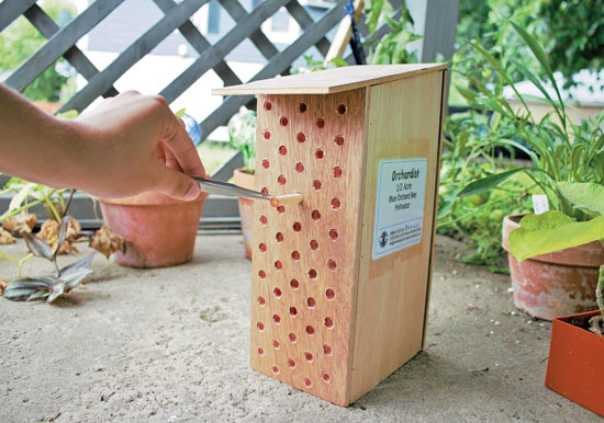 You can paint the outside of the house, add a roof, and mount the block to a post, fence, or shed where it will be secure and ideally catch the morning sun. Another option is to collect hollow stems from plants in your home landscape and place them together inside a structure. Paper straws are commercially available that will be readily colonized as well. You can leave these stems or straws outside in their structure during the winter, but you are likely to increase survivorship if you place them in a plastic container with a mesh vent and store them in a refrigerator or unheated building. In the early spring, place the plastic container in the garden and remove the mesh to allow emerging bees and wasps to leave.