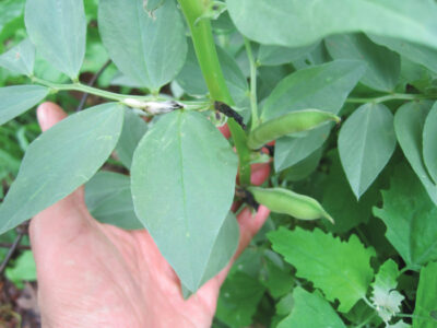 I acquired ‘Pinacate’ tepary beans from Native Seed Search, which originally got them from the Sonora region of Mexico. This specific strain of tepary is renowned for being able to produce a crop on a single rainfall, so I thought I’d see how they fared on my dry Ozark hill. In my first experimental planting of just 10 plants, I was able to score more than 2 cups of dry beans. And that was during a historic drought where we had no rain for more than 14 consecutive weeks!
