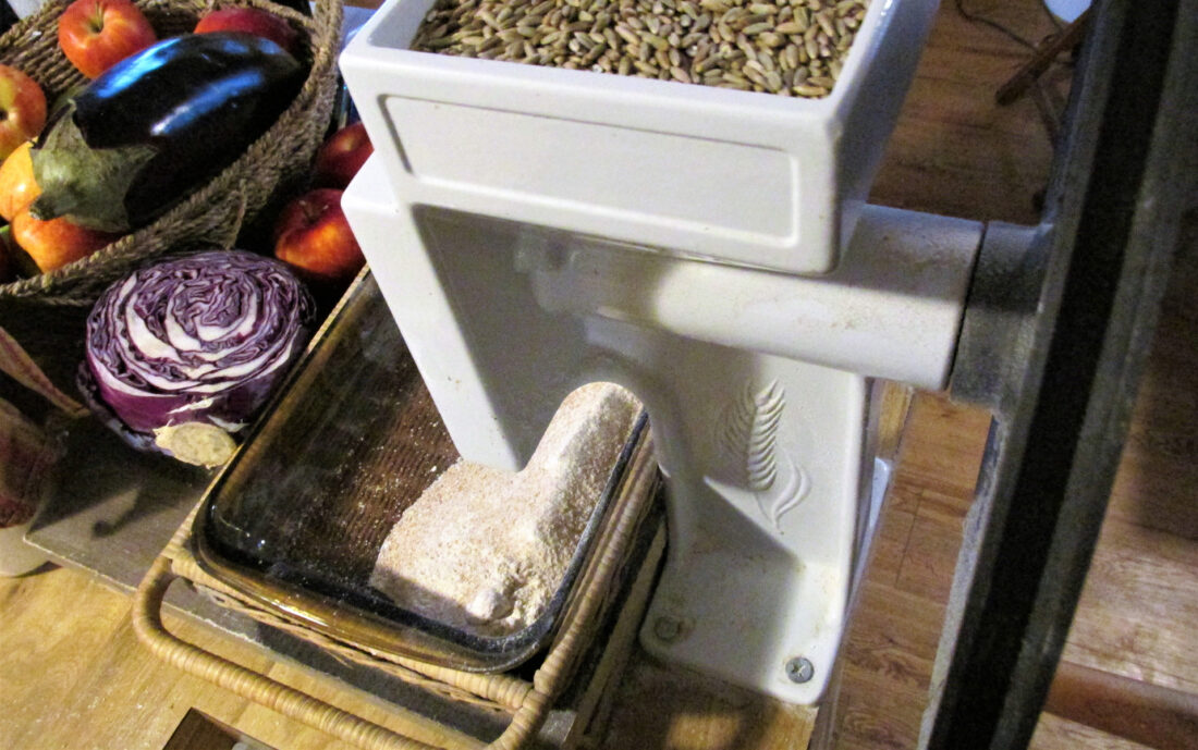 Now, millers are history. Those who want fresh-ground flour today need to take a step even further back in history and bring small hand mills back into their homes. Like the querns, manos, and matates, and hand mills of centuries near-forgotten, these small wheat-pulverizing devices return us to the true meaning of the “daily grind.” So, we purchased a like-new, manual, cast-iron mill from eBay and bolted it to the counter. It stands like a silent declaration of dependence-resistance, always drawing an inquisitive eyebrow-raise from those who enter.