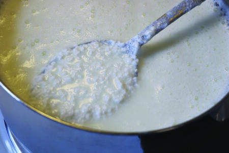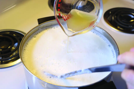 4. a-b. When the milk has reached 206 degrees and looks frothy on top, briskly stir in the vinegar. Soon, small curds that look like little clumps of cheese will form. This is coagulation.