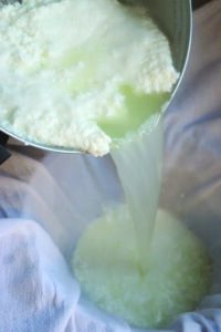 2.While the milk is heating, set the colander in the sink and drape the cheesecloth over it. If you want to catch the whey to use in other projects, place a big bowl under the colander.