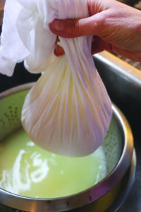 - After the cheese has finished draining, untie the knot and release the solid ball of cheese. Use immediately, or wrap tightly in plastic wrap and store in the refrigerator for up to a week.
