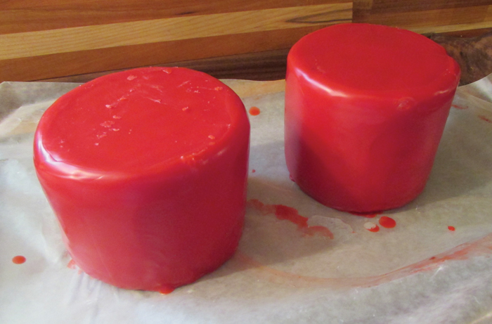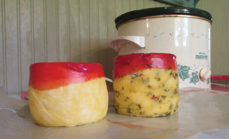 - When the cheese has developed a sufficient rind, it can be waxed. I use an old crockpot to melt the wax. You can use a designated brush with natural bristles to paint the wax onto the cheese, but I prefer dipping the cheese in the wax. I’ll coat half the wheel in wax, let it dry, and then coat the other half. Apply at least 2 to 3 coats of wax on the cheese so it’s completely sealed. Always use caution when working with hot wax. Cheese wax can be purchased from a cheese-making supplier and is reusable. When I’m finished, I’ll unplug the crockpot and store it with the remaining wax still in the pot.