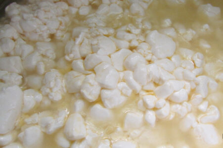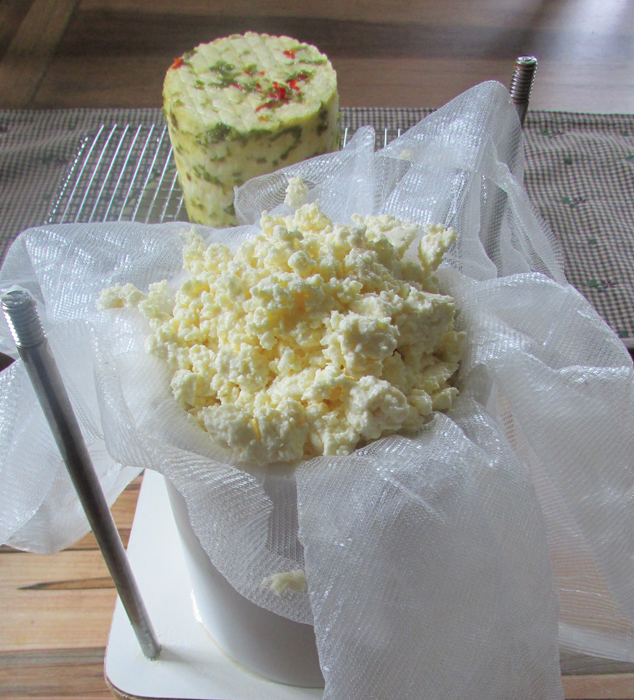 - When your curds have cooked, drain them through a large colander. I collect the whey to make ricotta cheese or to feed it to the chickens and pigs. It’s also a good fertilizer for the grass or garden. Some recipes call for salting the curds directly before pressing, while others give instructions for a saltwater brine to soak the cheese in after being pressed. Follow your recipe on whether to salt the cheese before or after pressing.