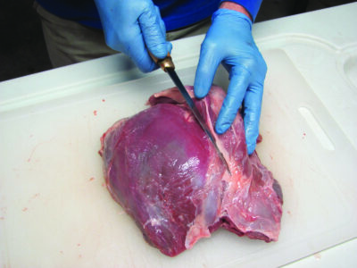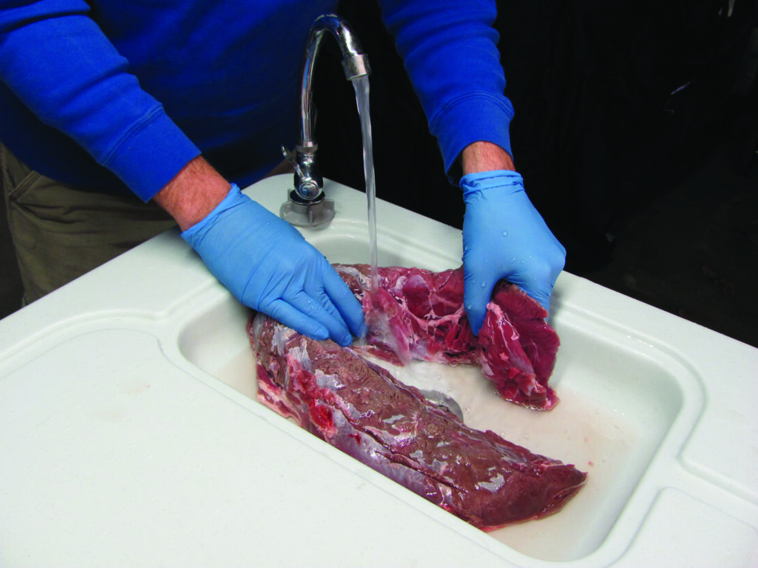 It’s best to have access to running water when cleaning your meat. This can be as basic as a garden hose and a washtub or utility sink, or, my favorite, a portable fish-cleaning table. Remove the meat from the cooler one bag at a time. Rinse the meat in cold water to remove hair, leaves, and other debris picked up in the field. Cut off any connective tissue (called “silverskin”), membrane, and fat from the meat. Rinse the inside of the zip-close bag, return the meat to the bag, and put the bagged meat back in the cooler in preparation for ageing.