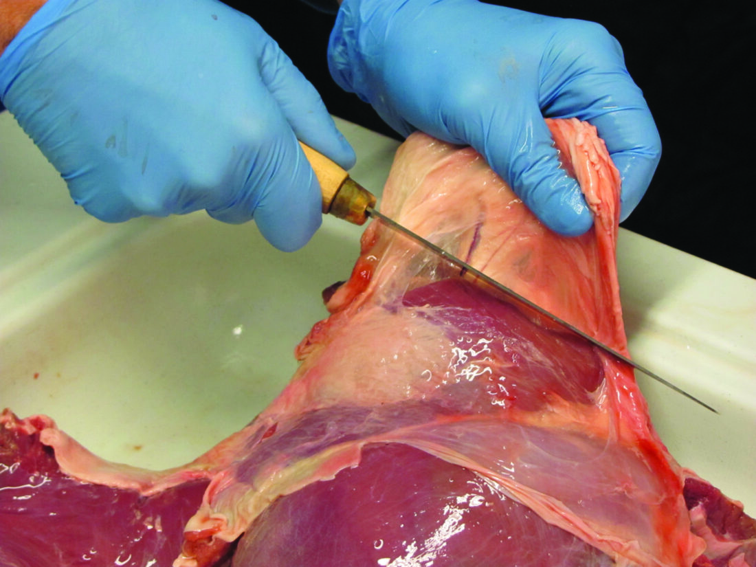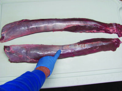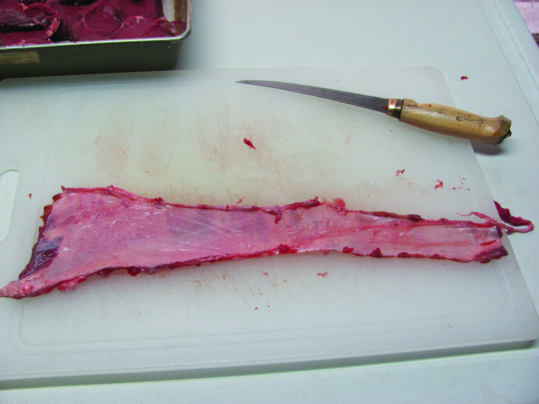 The silverskin that runs along the backstrap is the longest strip of natural sinew on a deer and can be used as thread for stitching. To harvest the sinew, don’t cut through this silverskin when cutting the backstrap steaks, but fillet each steak from this connective tissue. Hang the sinew in a low-humidity environment and allow it to dry completely. To use for sewing, peel the strands from the sheath, and then soak them in water or wet them with saliva. Once wet, the sinew will be flexible and ready for stitching.