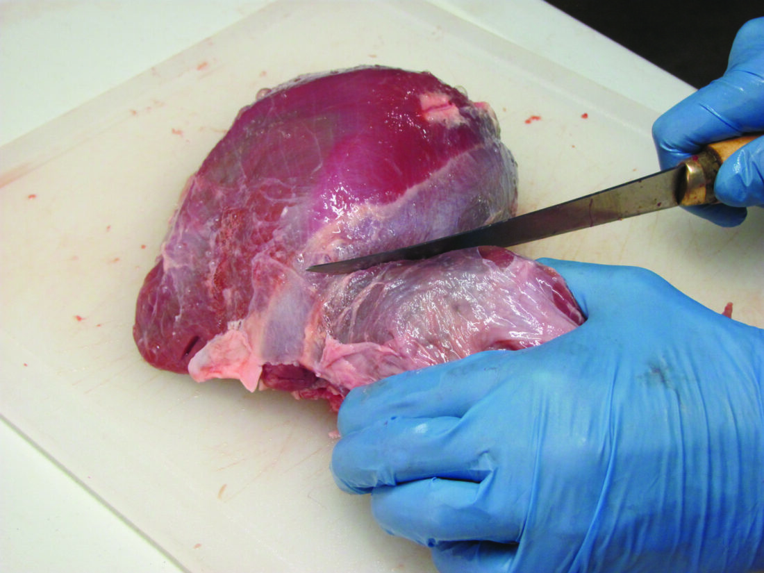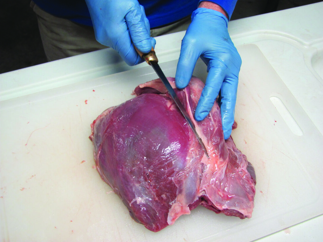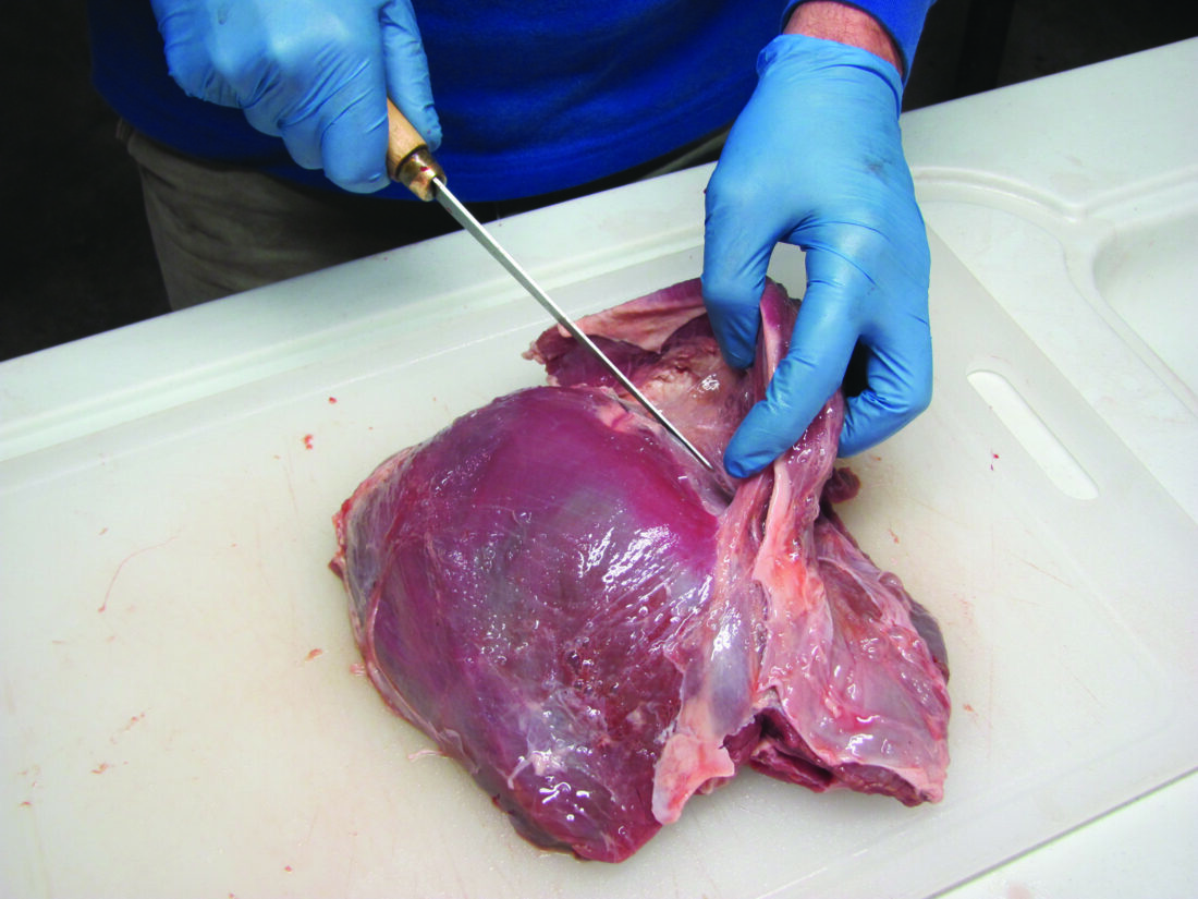 A sheath of thin membrane covers each muscle. Where muscles meet, this membrane forms a thin, light-colored line. Cut along that line and pull the muscles apart. This is best seen in the rounds, pictured above. There will be 3 to 5 muscles in the rounds, depending on how they were deboned in the field. The tenderloins, backstraps, and shoulders were separated into individual muscles in the field.