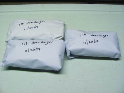 Prolonged exposure to air in a freezer causes freezer burn, so, when packaging in zip-close bags, squeeze the air from the bags, close the zipper, and wrap the bags in freezer paper. Mark the packages with the contents and the date the animal was killed. A vacuum sealer is also good for packaging venison.