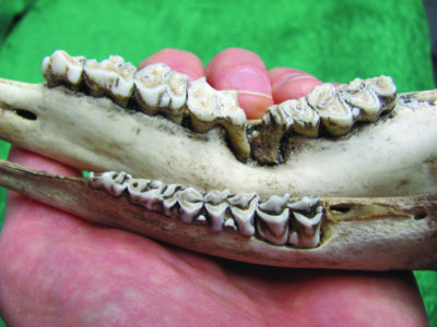 Like other mammals, deer begin life with baby teeth, or milk teeth. Adult teeth replace the baby teeth at a predictable rate. To age a deer, use the teeth on one side of the jaw, called “premolars” and “molars,” as a reference. (Ignore the front teeth.) Depending on the deer’s age, there will be 4 to 6 teeth on one side of the jaw.