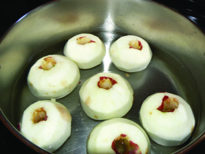 - Rinse, core, and peel the apples. Place into a large pot and cover with just enough water to keep the apples from burning.