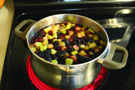 - Add rhubarb, blackberries, and water to a large pot and bring to a boil, stirring often.