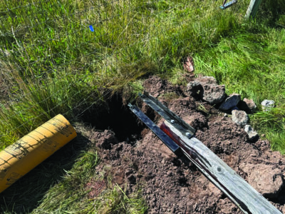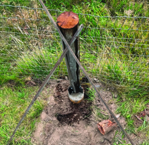 When the first few posts went, it seemed like the only option was to maintain the status quo. A T-post smack in the middle of all of those nice-looking wooden fence rails would really look trashy. Years ticked by, with four or five post replacements every season as they started to exhibit the telltale listing that indicates that the Earth’s hunger for decomposables vanquished whatever chemical cocktail the manufacturer injected for longevity. One morning, I woke up in a cold sweat after a visit by the Ghost of Landowners Future. I realized that while I didn’t put them in at first and I don’t mind replacing them now, someday the retiree with bad ankles will be me, and he’s going to be the guy to do the work the next time they need to be replaced. Nobody needs to do this when they’re an old fart with dicey shoulders and knees and they’d rather not fuss with it. Maybe I’ll have the money to pay a pro at that point, and then again, maybe I’ll still be the same cheapskate I am now.