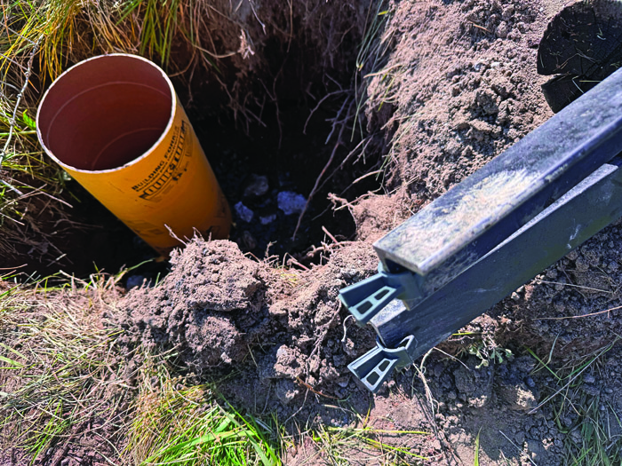 I sunk two angle irons into each concrete footing so the post has a nice set of datums to align itself with, not to mention some extra strength when the steers pick out that particular post to scratch their itchy heads on. To establish those datum stops, I bolted the angle iron to the post before it went into the concrete. This will ensure the post – and all the posts that come after it – is where it should be. I put some old fence wire strategically into the concrete hole to add strength to the pour.