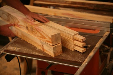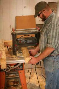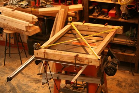 Once I had all of the framing pieces and legs cut from the timbers, I sized them using a small thickness planer that I picked up for very little money at a yard sale. The nice thing about a thickness planer is that you can get all four edges smooth and you can make boards with precisely uniform cross-sectional dimensions. Hand planes work well for this also, but the thickness planer took hours off the truing and smoothing time.