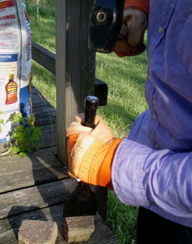 To score, set the chisel against the brick on the marked line and wrap your hand firmly around the straight part of the chisel, keeping your fingers and thumb between the striking surface (‘hammer’ + ‘fingers’ = ‘bad’), and where the chisel starts forming the blade. Hold the chisel upright and steady but don’t squeeze – squeezing will transmit the shock of the hammer blows to your hand and can tire or injure your hand; I find that wearing gloves really helps with this, because your skin doesn’t stick to the chisel. If you’ve never done this before, lightly tap the top of the chisel with the hammer a couple of times, holding the hammer so that the head is a couple of inches above the chisel, and then dropping it. This will give you a feel for what’s going on. Repeat this if necessary until there is a visible mark on the brick.