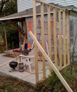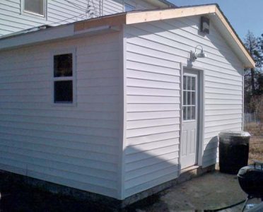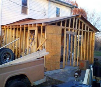 Since I am not a very good carpenter (I don’t know jack about creepers), I decided to go with a regular old gable roof instead of the hip. I am good at math so laying out the common rafters and cutting them was fun. Setting the ridge board all by myself was a trick, but it wasn’t too difficult. It took me three days of vacation to get from the last photo to this one — luckily I scheduled the vacation when Mother Nature scheduled 6 consecutive days without rain. Notice the interior framing of the new mudroom. The room to the right will house the hot water heater, washer and drier. The long room on the left will be the entry way and pantry. I got the thing shingled and partially sided by Thanksgiving — and then the arctic blast hit.