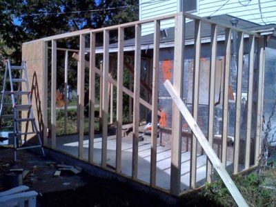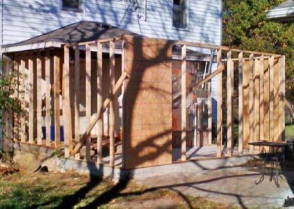 Once I had the slab paid for, I commenced to frame the new space — actually it took me until October to begin the framing. I used treated lumber for the bottom plates and regular stud-grade lumber for the studs and top plates and the like. I used blue Tapcon concrete screws and Liquid Nails construction adhesive to secure the the bottom plates to the slab. I didn’t tear off the old roof until absolutely necessary to protect the existing bathroom, which is behind the aluminum-faced Celotex-clad walls.