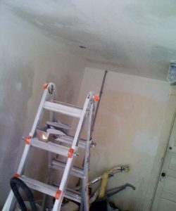 When the weather turned bitter in early December, I hurried to get the windows and door installed. I wrapped exposed pipes with heat tape and insulation — pipes still froze, but thankfully none broke. With the help of a propane-fired construction heater, I warmed up the space sufficiently to run wiring in the outside walls and in the ceiling. Then in January, I stuffed insulation between the studs and ceiling joists, and sheet rocked — suddenly it was much warmer inside and pipes remained not-frozen, even on a zero-degree night. My partner in culinary crime helped with rocking the ceiling — oh what a pain that was without renting a jack. I finished up the plumbing last week and need to mud some of the sheet rock still, but I can see the end in sight.