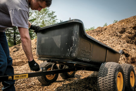 These all-purpose trailers are usually constructed of either polyethylene (heavy plastic) or powder-coated steel, and are equipped with large flotation tires for driving over rough terrain. They come in single- and double-axle versions and can haul up to 2,000 pounds. Some all-purpose trailers are outfitted with electric brakes to help control large loads, and the ability to dump the load by either a manual lever, a winch, or electrical power. These trailers are stable on rough terrain because many use a lawn-mower-type axle that allows the wheels to articulate (move up and down individually). This keeps the load stable when you’re moving slowly over rocks and logs.