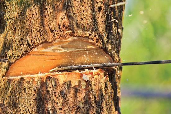 With your chainsaw fueled, sharp, and properly tensioned, and your helmet, chaps, and boots on, you are ready to go. The first order of business is to “read” the tree. If it has dead branches (widow-makers), you may decide not to cut it. Significant lean or weight distribution on one side is another issue. If it is leaning hard in the direction you want it to fall, it could split (called a “barber chair”) on the way down, and hit you. Leave it. Then look for other hazards, including nearby dead trees and vines. I have seen dead snags come crashing down from the impact of a falling tree, even though it never touched it. There is nothing wrong with walking away from any tree that gives you an uneasy feeling.