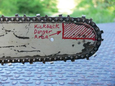 The good news is that chainsaws are safer nowadays than they were previously, without compromising utility. The inertia chain brake usually stops the chain in the event of a kickback. You can also engage the brake manually by pushing forward on the chain brake. The proper way to do this is to keep both hands on the saw and roll your left wrist forward against the brake lever. Do NOT take your right hand off the handle to push the lever. You lose control of the saw and, if your hand misses the lever, it is moving right toward the chain. Practice engaging the chain brake (the saw does not need to be running) until it is second nature to roll your left wrist into the brake bar.