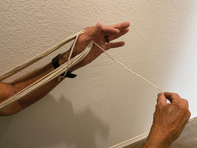 - Again, fully extend your arms to draw another length of rope and then bring the rope back to your left hand, this time running it through the space between your forefinger and thumb from the back of your hand. Repeat the process, alternating the rope forward and backward in your hand. (Notice my hands and rope placement in Butterfly 1.)